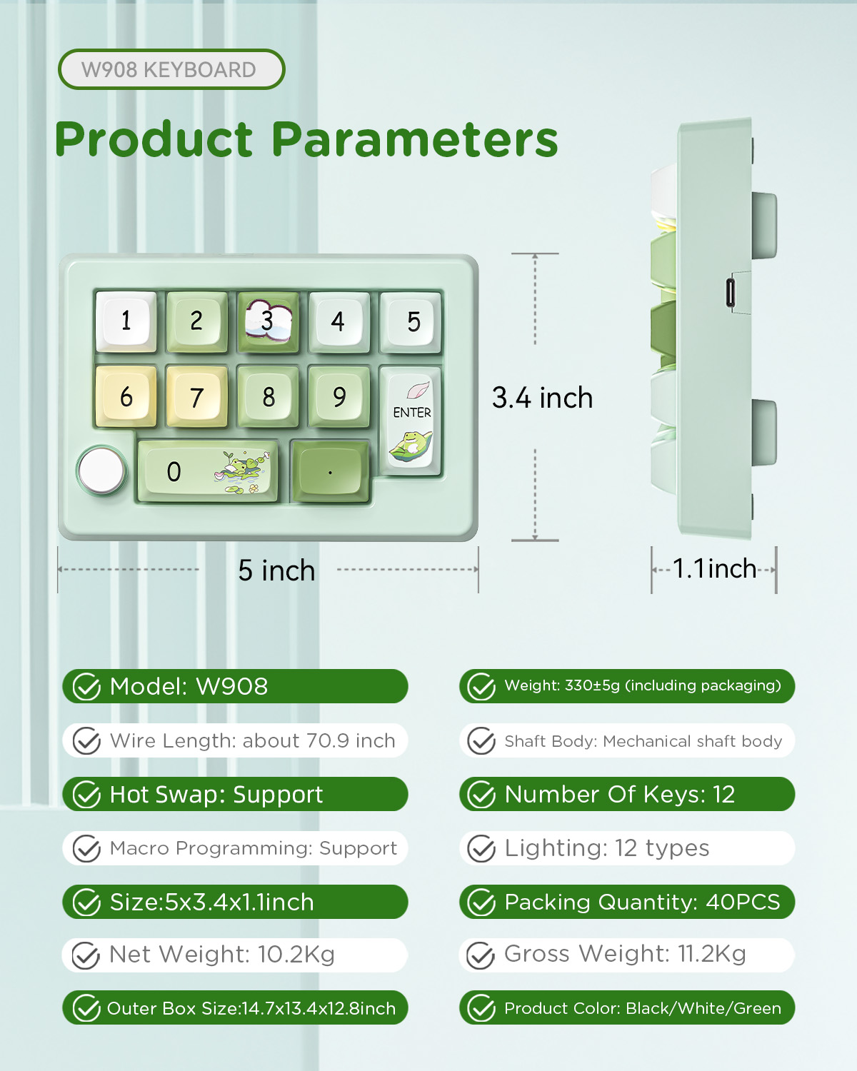 Product introduction: SXS-W908 is an RGB light effect 12 key macro definition wireless the third mock examination game keyboard, plug and play. Comfortable grip, compliant with ISM (Industrial, Commercial, Medical) requirements. The lighting effect is cool and charming, coupled with powerful driving functions. Plug and play. The return rate is as high as 1000Hz. Ergonomic design, comfortable anti slip roller. The mouse has a comfortable grip, natural texture, and unique creativity.